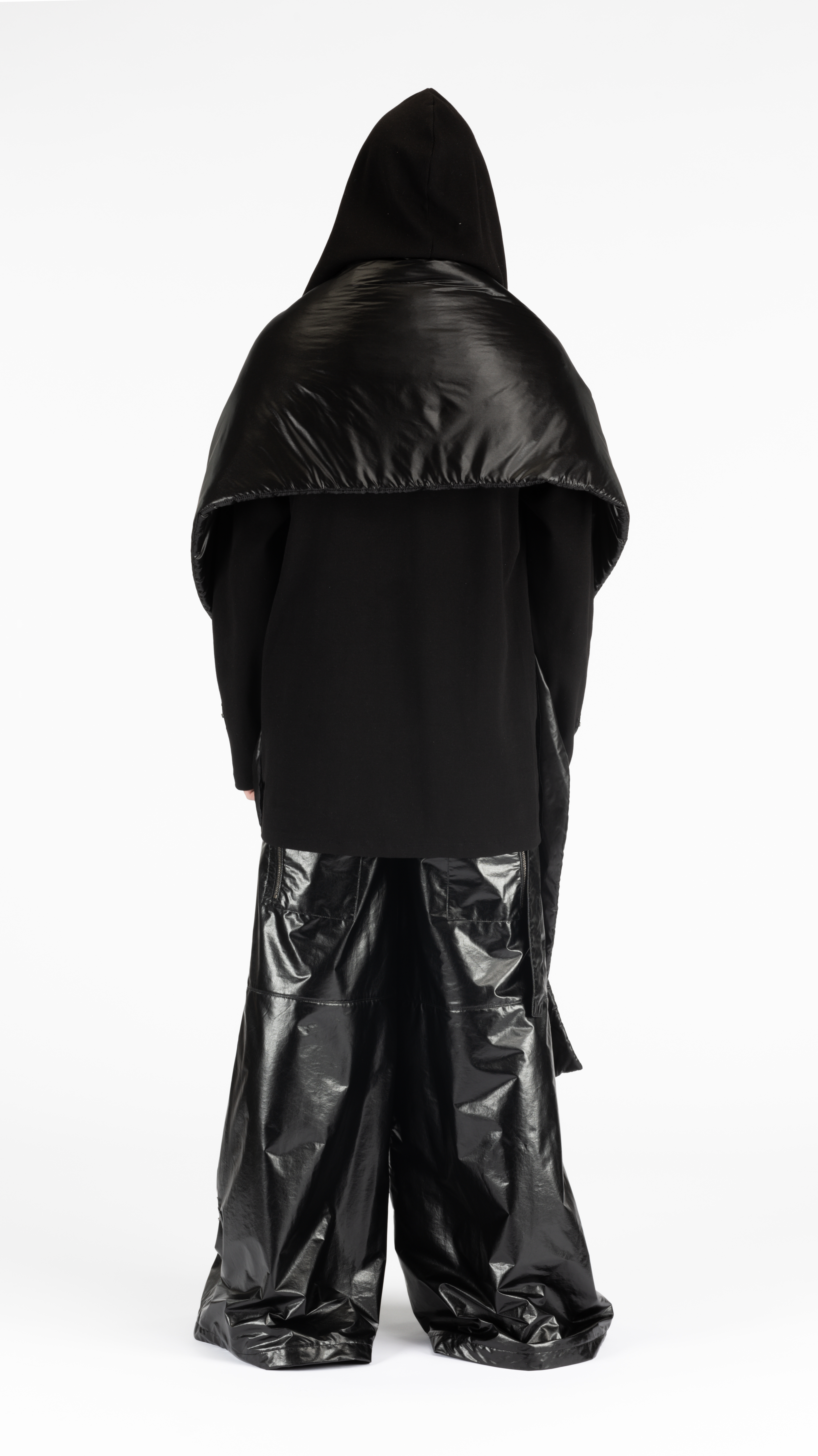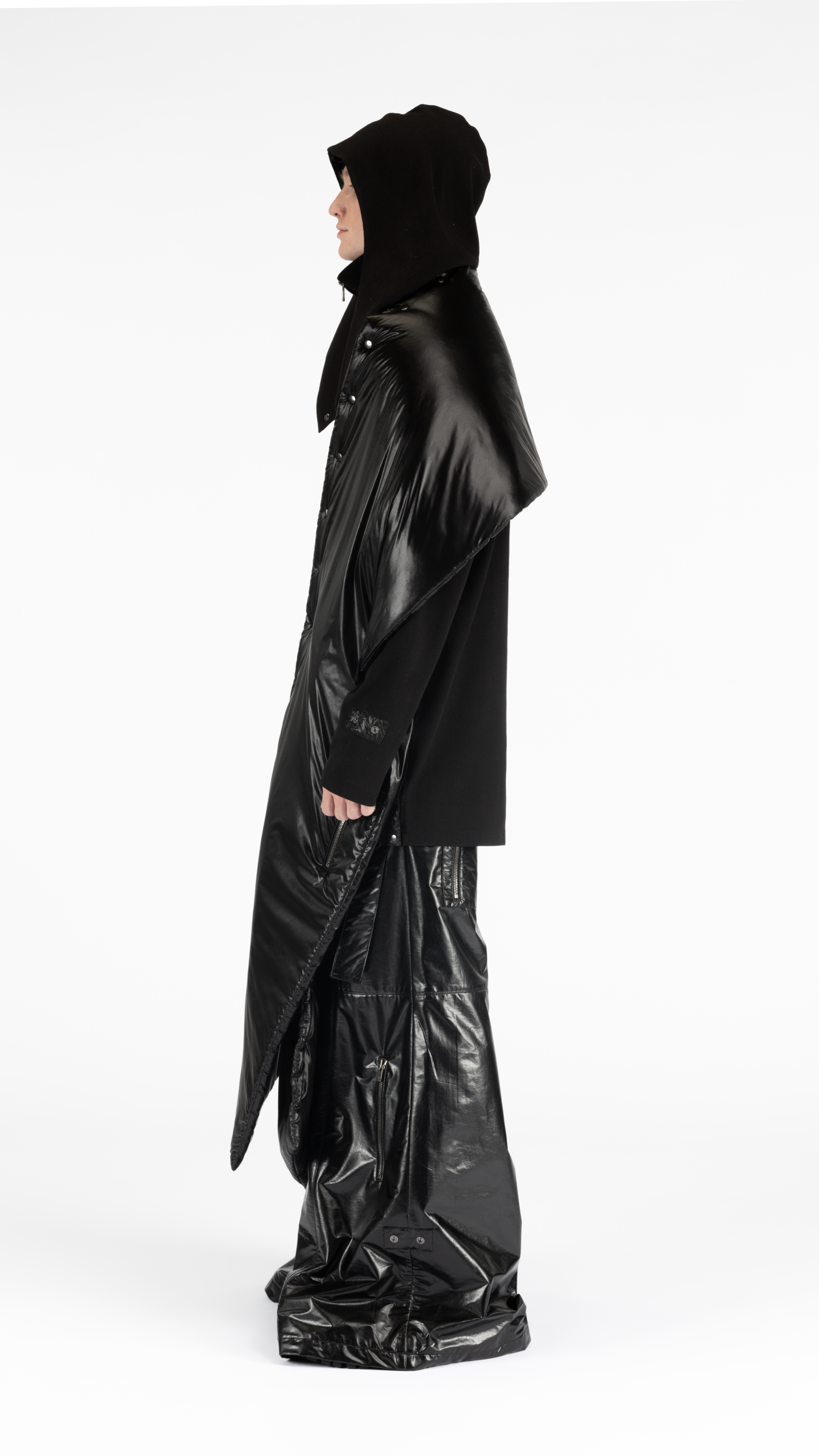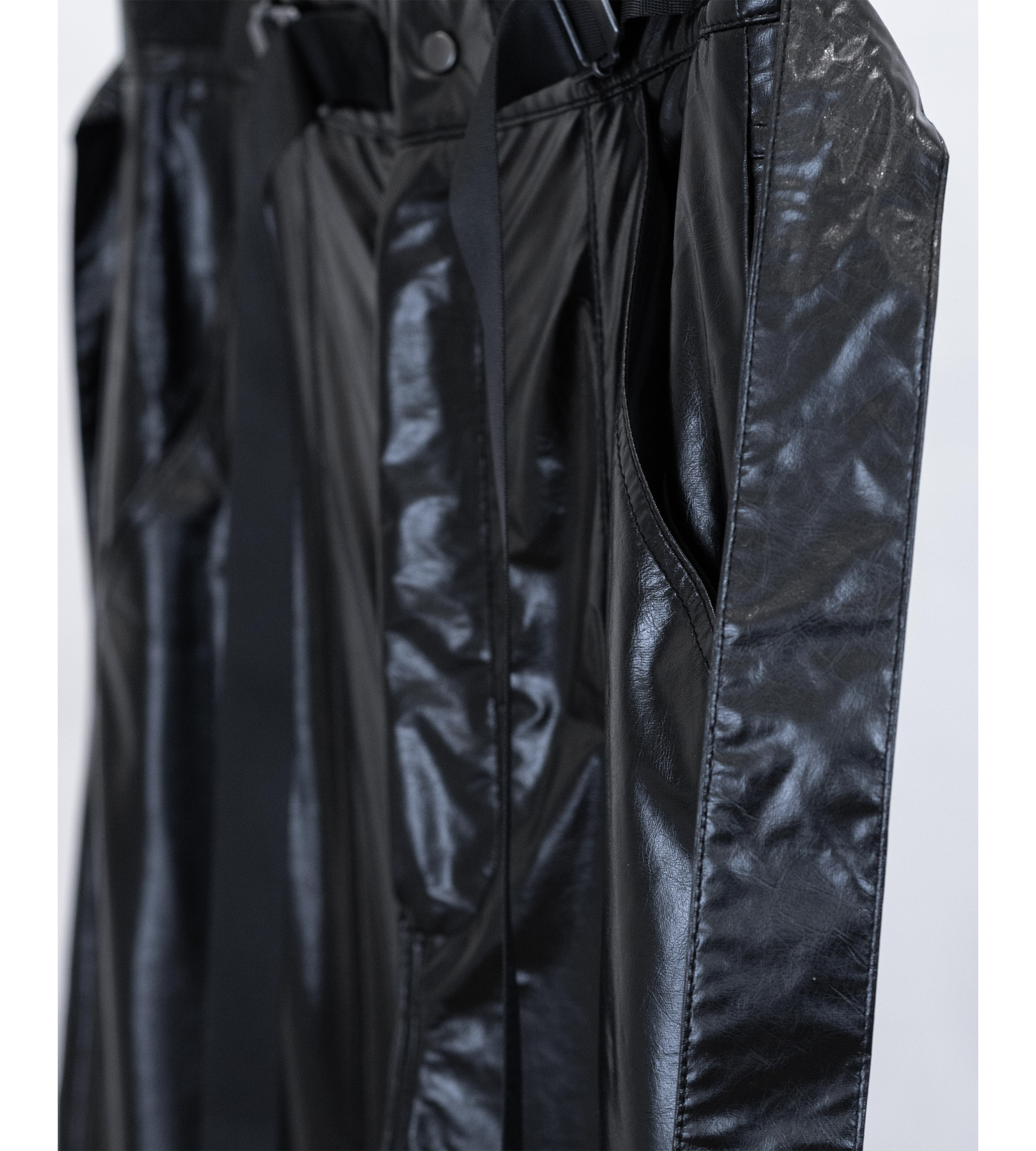 This aw22 wide-leg pants are full-length with a low crotch. They feature a zipper fly, a waistband with Charmaine Lam’s signature wide belt loops, pair of attached adjustable webbing straps on the waistband, an extra detachable belt, and close with a popper. They have two side pockets, two exposed zipper pockets on the lower legs, and two exposed zipper patch pockets on the back.